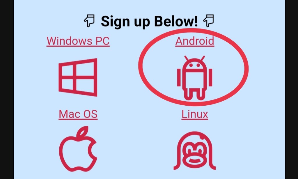 Scroll ke bagian bawah sampai bertulis kan “Sign Up Below!” klik yang berlogo Android.