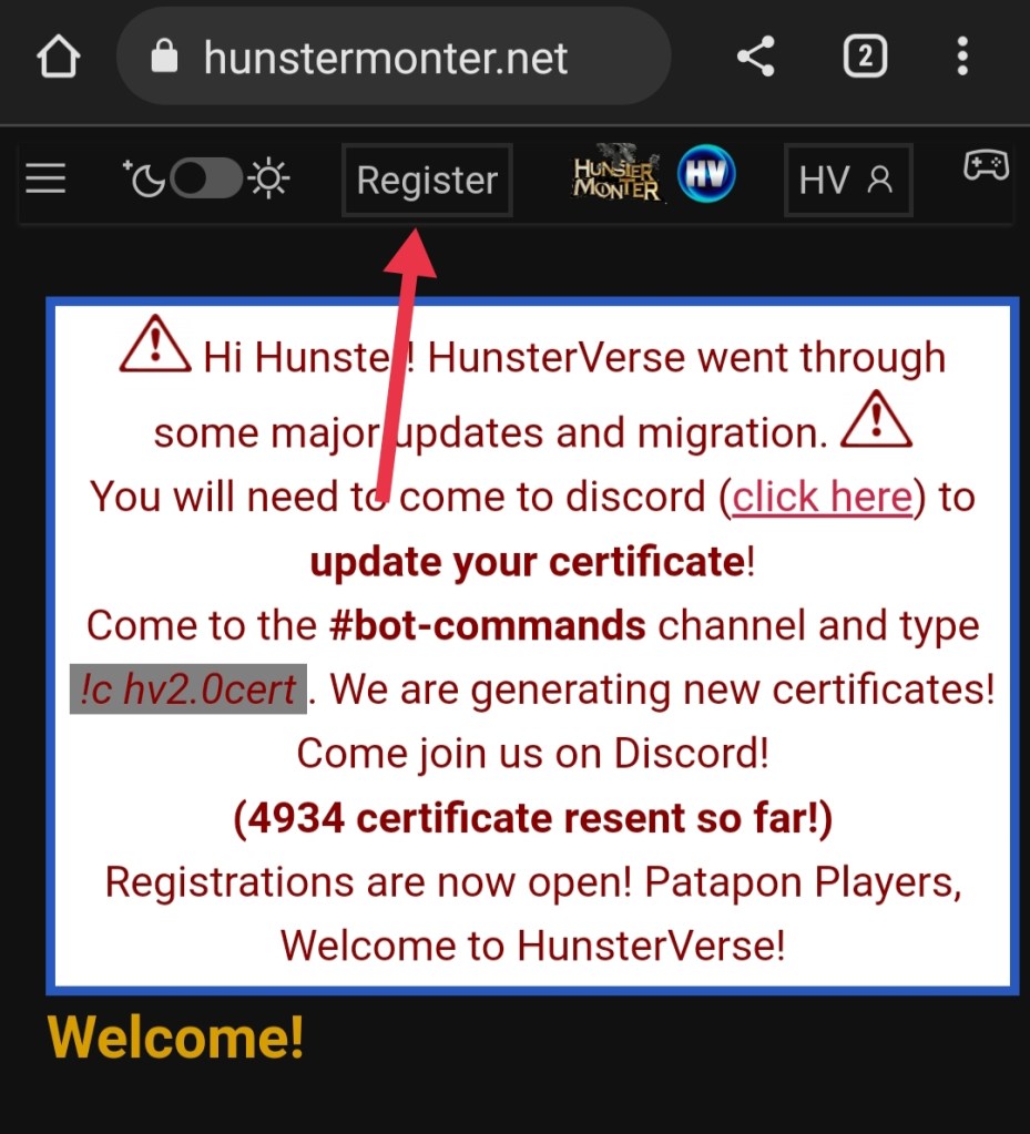 Langkah pertama yang harus dilakukan yaitu Masuk ke Website Huntermonster.net untuk membuat akun HunterVerse. Setelah masuk ke Website itu klik yang bertuliskan tulisan “register” di bagian atas.